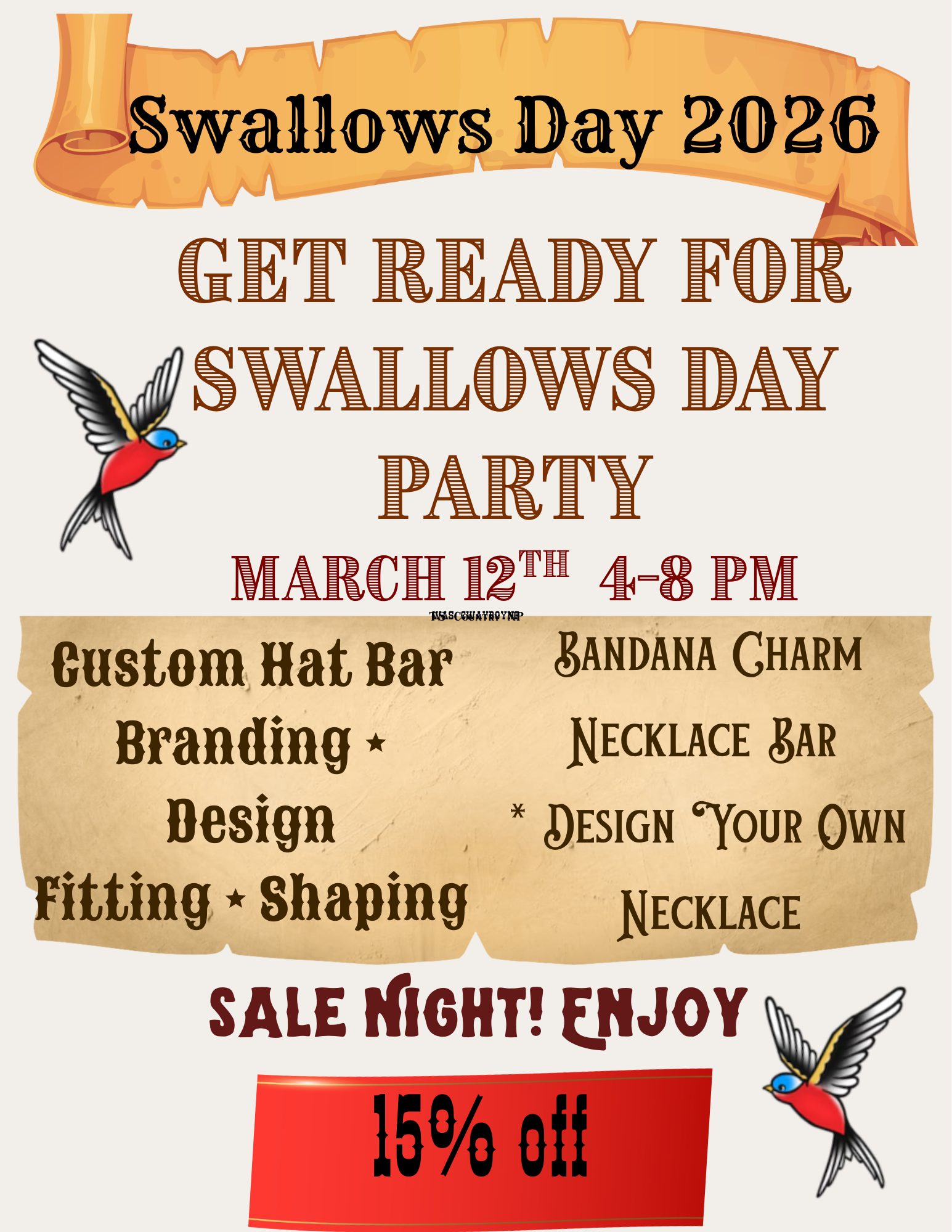 Get ready for Swallows Day Party! Join us for a Custom Bandana Charm Necklace event and design your very own necklace. Custom Hat Bar will be open with branding for hats, boot and leather items purchased. 15% off that evening (excluding hats, jewelry).