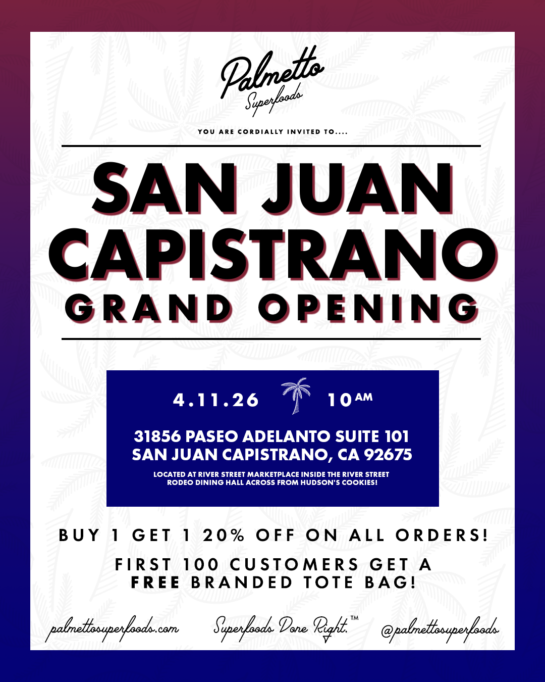 Back to All Events Palmetto Grand Opening Event Saturday, April 11, 2026 10:00 AM 6:00 PM Google Calendar ICS