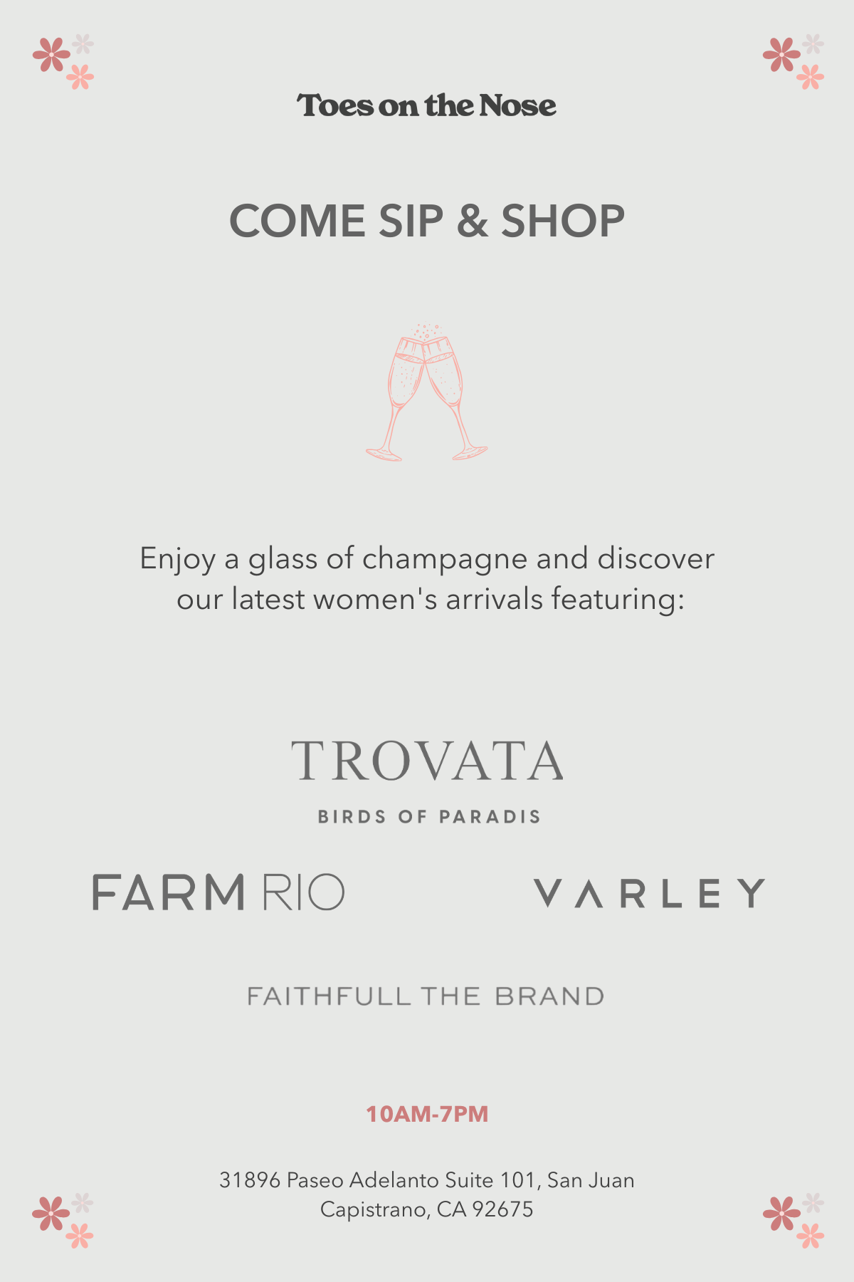 Back to All Events Toes On The Nose Sip + Shop Friday, April 3, 2026 8:00 AM 7:00 PM Google Calendar ICS